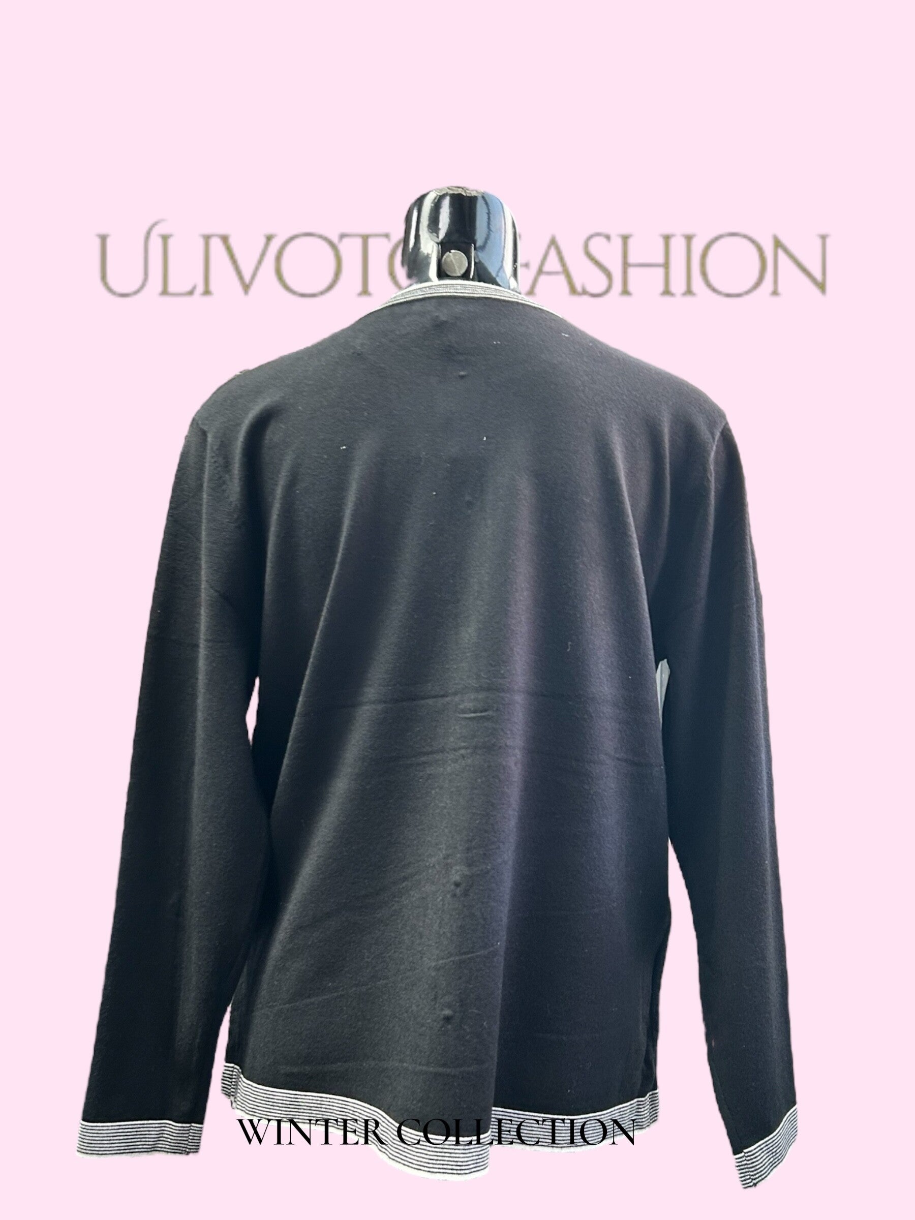 De trui Classic Touch combineert comfort met een verfijnde stijl. Het ontwerp met knopen aan de voorkant, voorzien van unieke vormen en glanzende details, geeft een elegante en onderscheidende uitstraling. De contrasterende randen benadrukken de zorgvuldige afwerking en maken deze trui ideaal voor zowel casual als meer geklede looks.