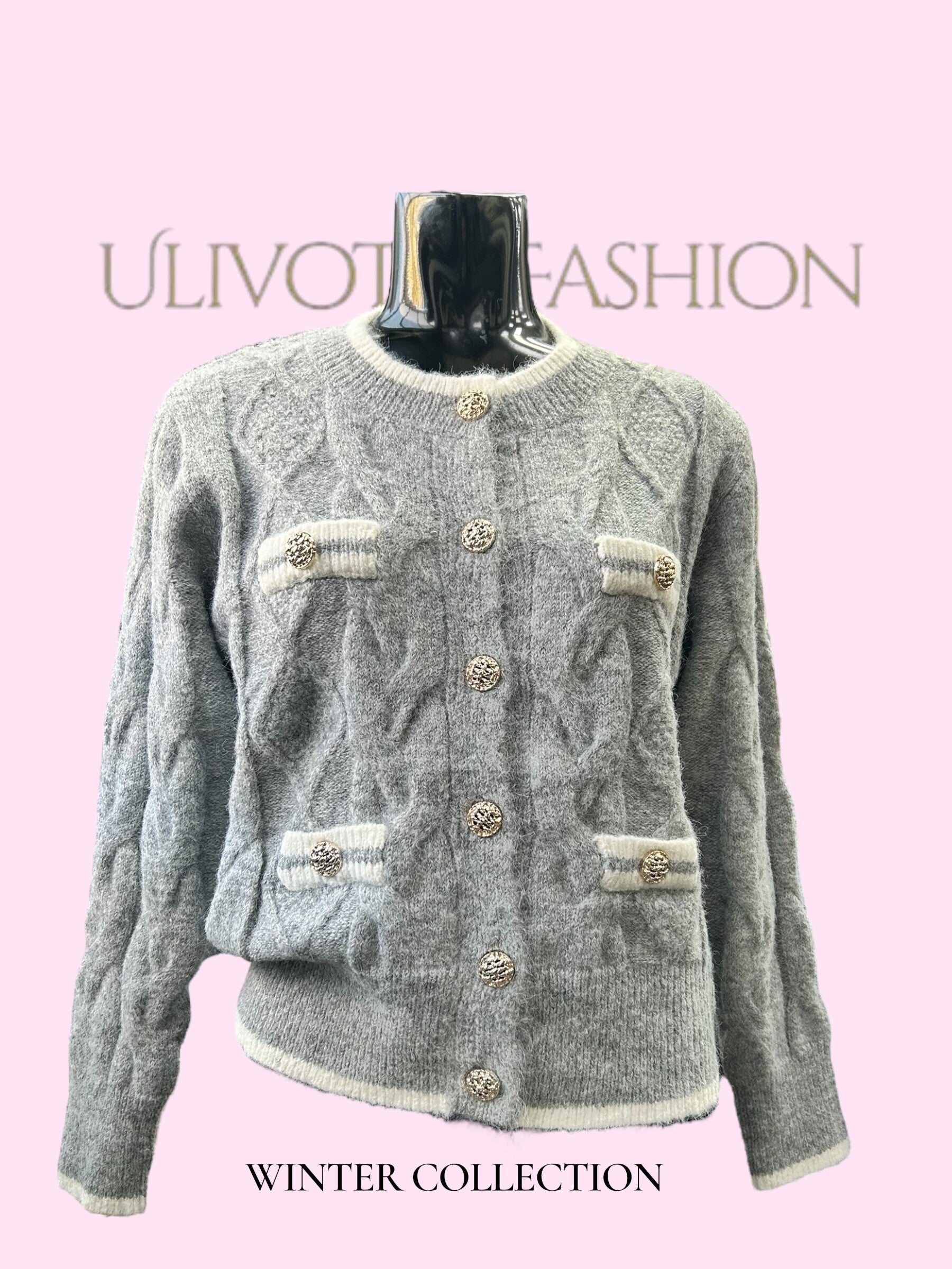 De Elegant Charm trui straalt klassieke elegantie en verfijning uit. Het gevlochten breisel in combinatie met decoratieve, glanzende knopen geeft een chique en unieke uitstraling. De contrasterende details aan de hals, manchetten en voorkant benadrukken de zorgvuldige afwerking en maken dit kledingstuk veelzijdig voor elke gelegenheid.