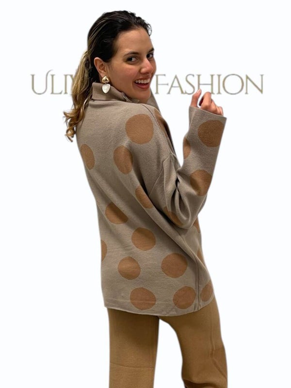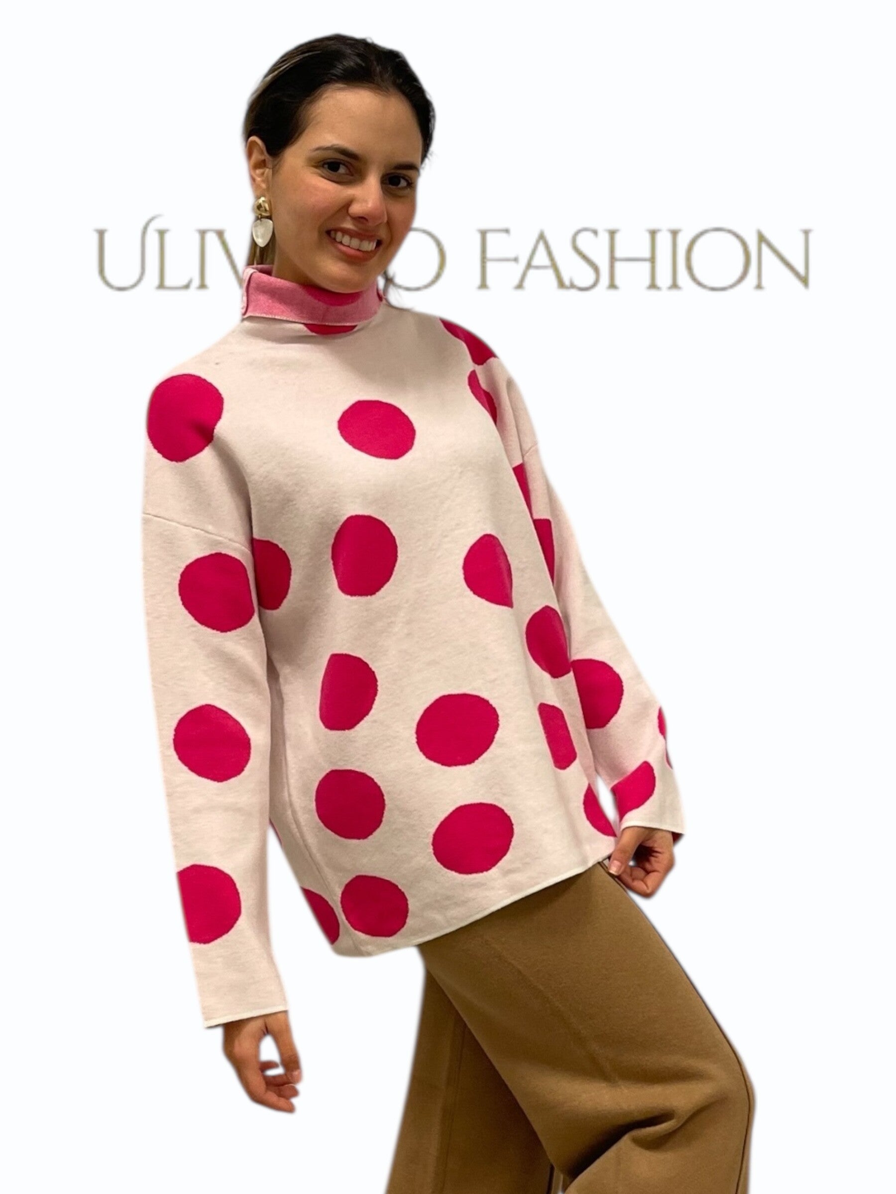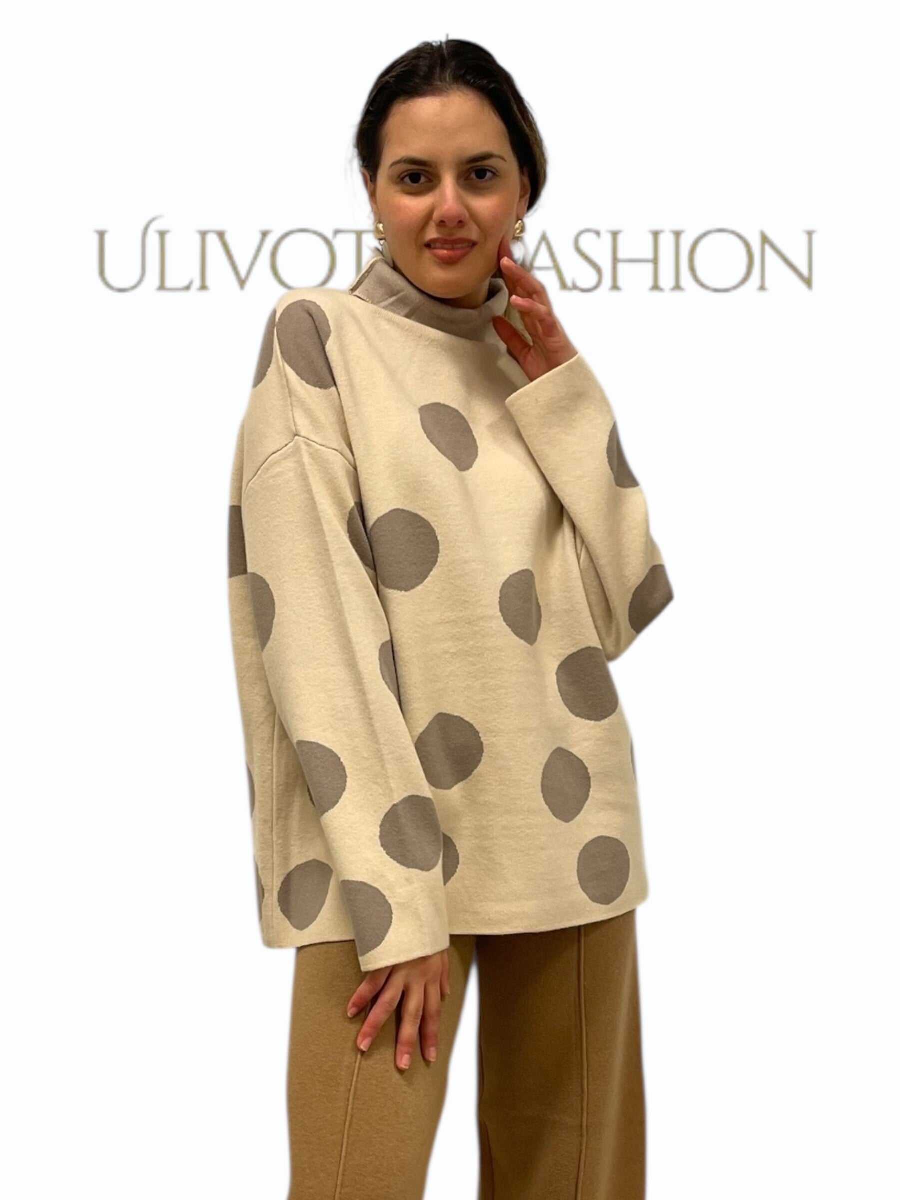 Deze trui met stippen combineert een speelse uitstraling met elegantie en comfort. Gemaakt van zachte viscose, perfect voor het seizoen dankzij de warme en lichte textuur. De subtiele col en wijde mouwen geven een moderne en comfortabele touch, ideaal voor een casual of stijlvolle look. Verkrijgbaar in de maten S/M en L/XL, en in meerdere levendige en neutrale kleuren die bij elke stijl passen.
