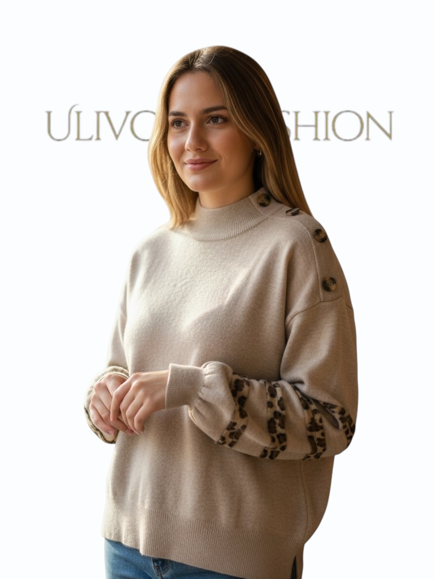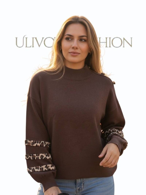 Deze elegante sweater straalt pure luxe en verfijning uit. Het zachte, comfortabele breisel wordt prachtig geaccentueerd door de subtiele knoopdetails op de schouder en de verfijnde leopard-accenten op de mouwen. Een stijlvol statement dat moeiteloos comfort en klasse combineert. Perfect voor een chique casual look, zowel overdag als in de avond.