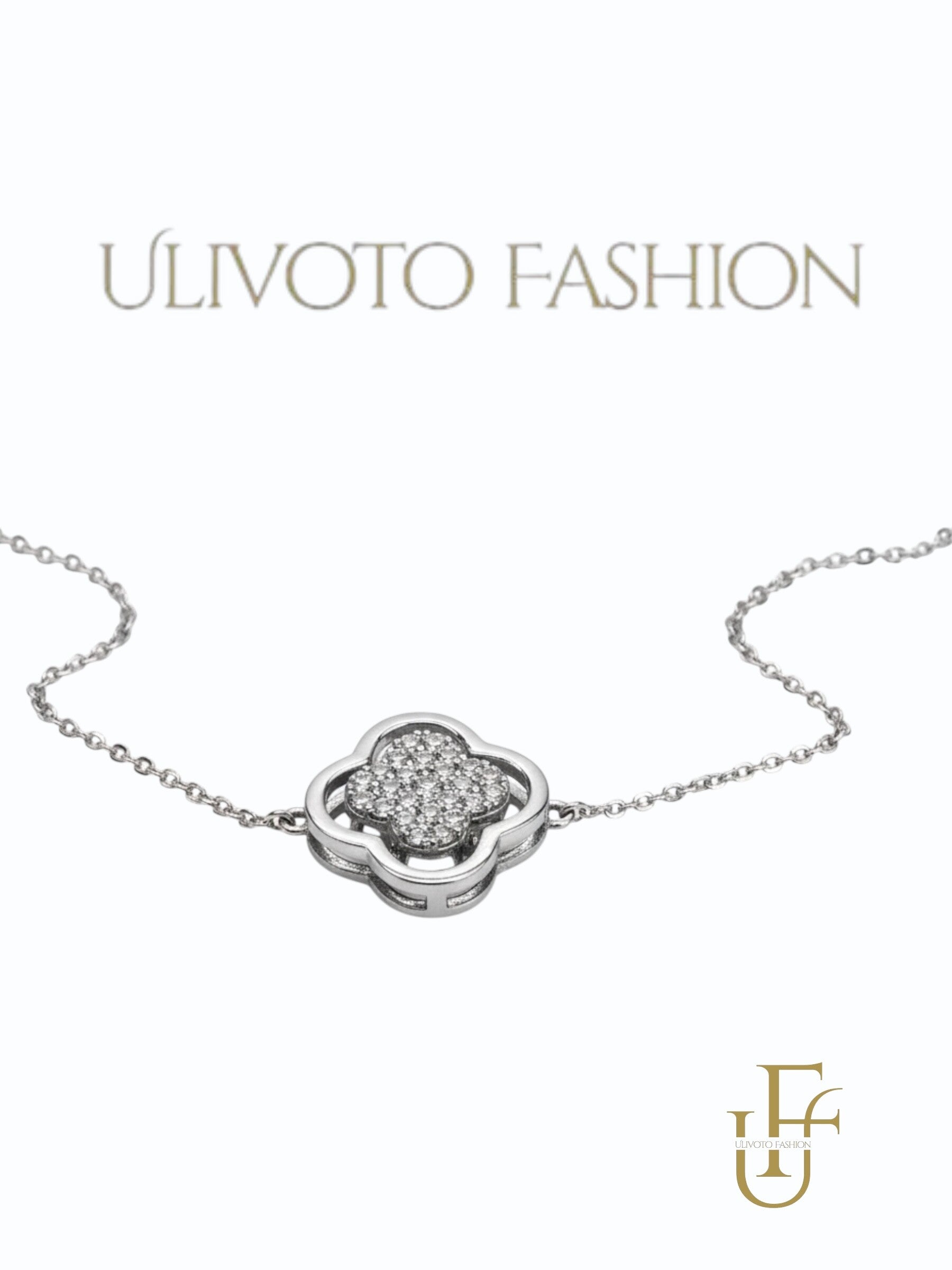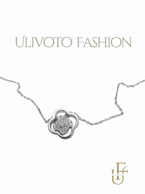 Deze zilverkleurige dames ketting met klaver hanger straalt elegantie, geluk en luxe uit. De verfijnde klavervormige hanger is volledig bezet met glinsterende steentjes, wat zorgt voor een chique en tijdloze uitstraling.