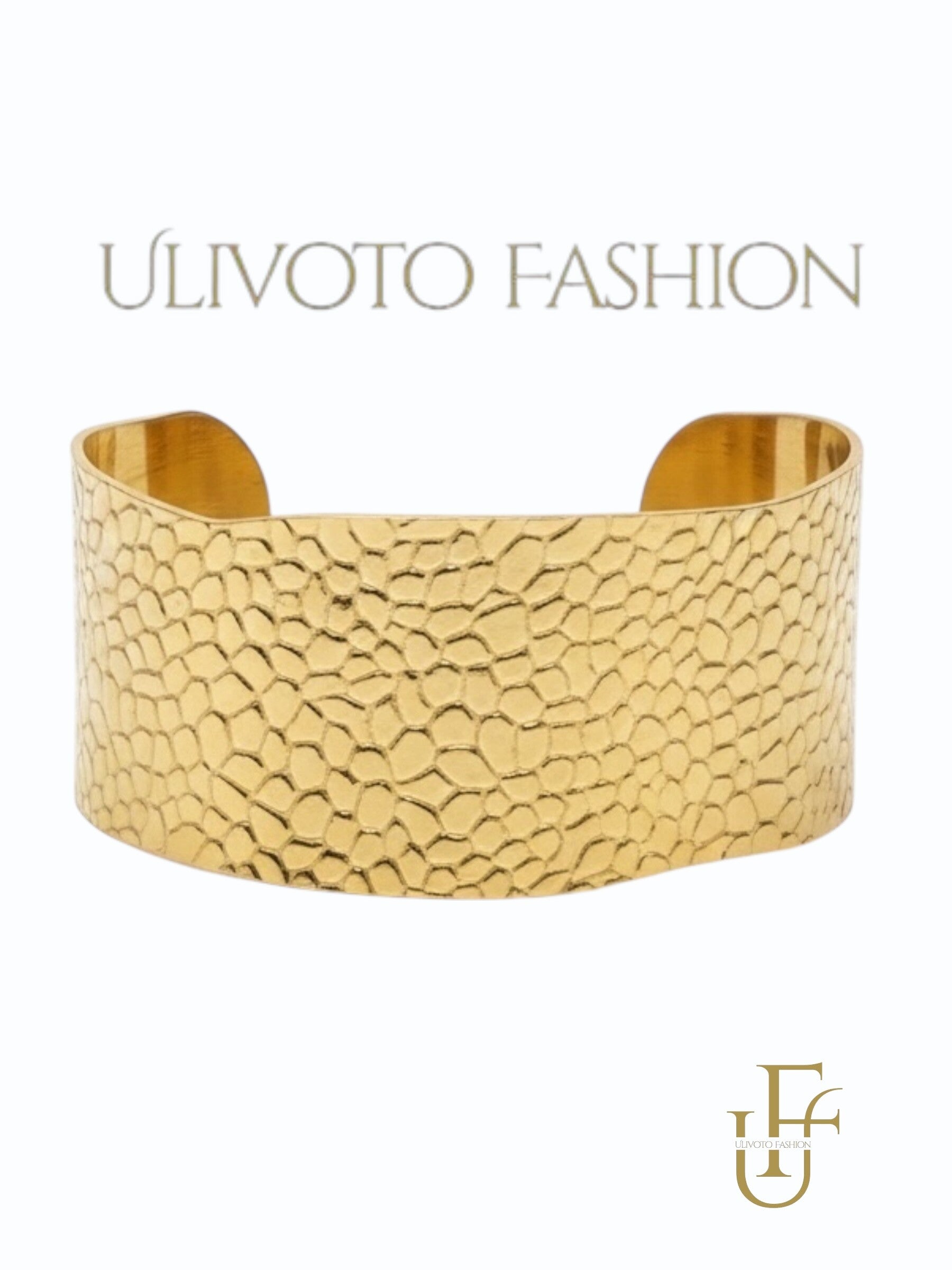 Deze brede gouden cuff armband is een echte eyecatcher. Het gehamerde, organische patroon geeft de armband een luxe en ambachtelijke uitstraling, terwijl het open cuff-design zorgt voor een comfortabele pasvorm.
