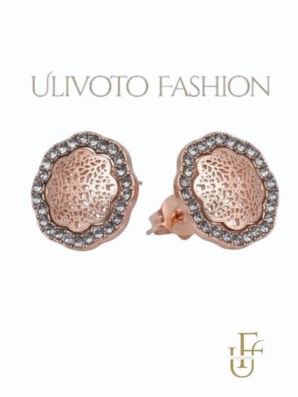Deze roségoudkleurige oorstekers hebben een verfijnd vintage design met een sierlijk opengewerkt detail in het midden. De rand is subtiel bezet met fonkelende strass steentjes, wat zorgt voor een elegante en luxueuze uitstraling.