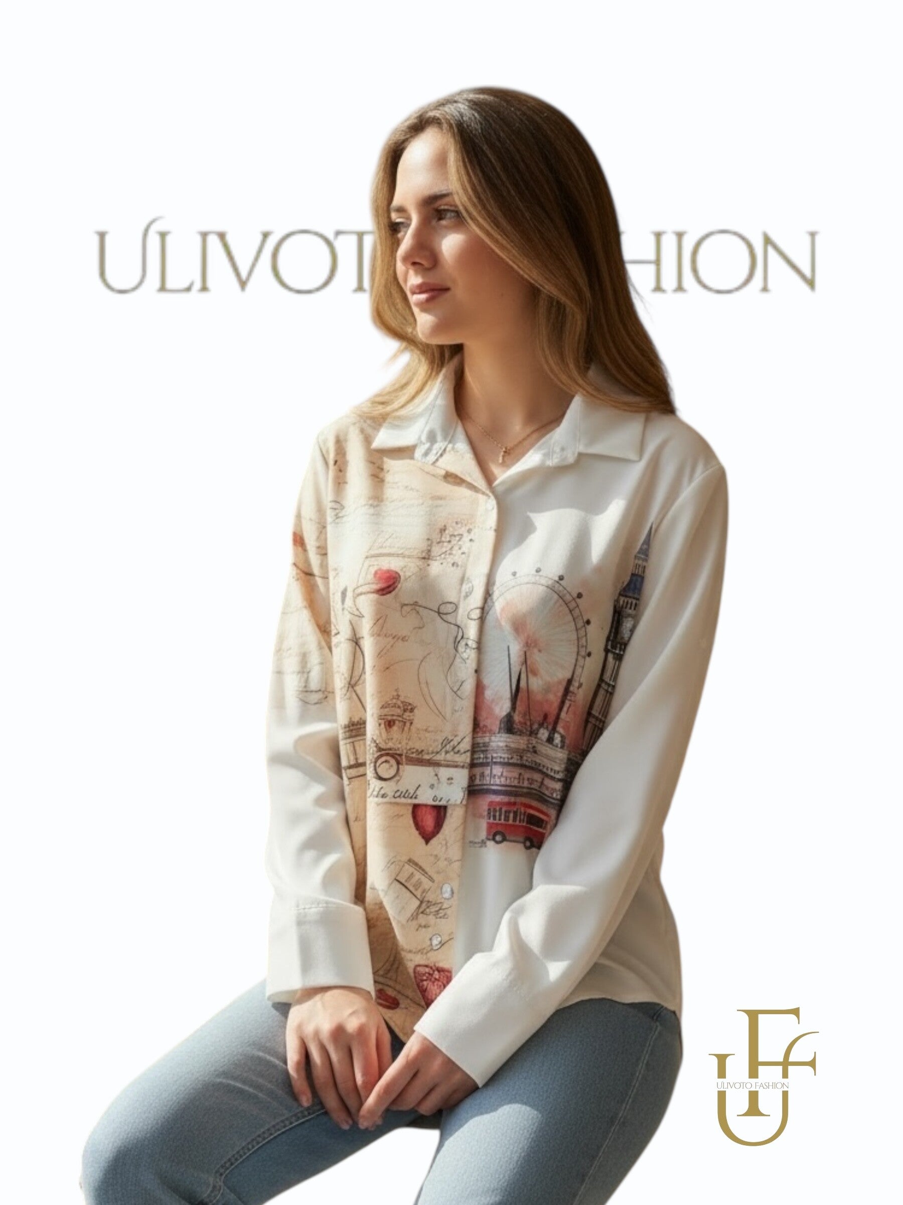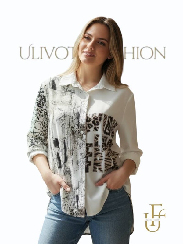 Deze stijlvolle damesblouse combineert elegantie met een moderne twist. De blouse heeft een verfijnde mix van artistieke prints en subtiele luipaarddetails, wat zorgt voor een unieke en modieuze uitstraling. De lichte beige- en wittinten maken dit item makkelijk te combineren en perfect voor elk seizoen.