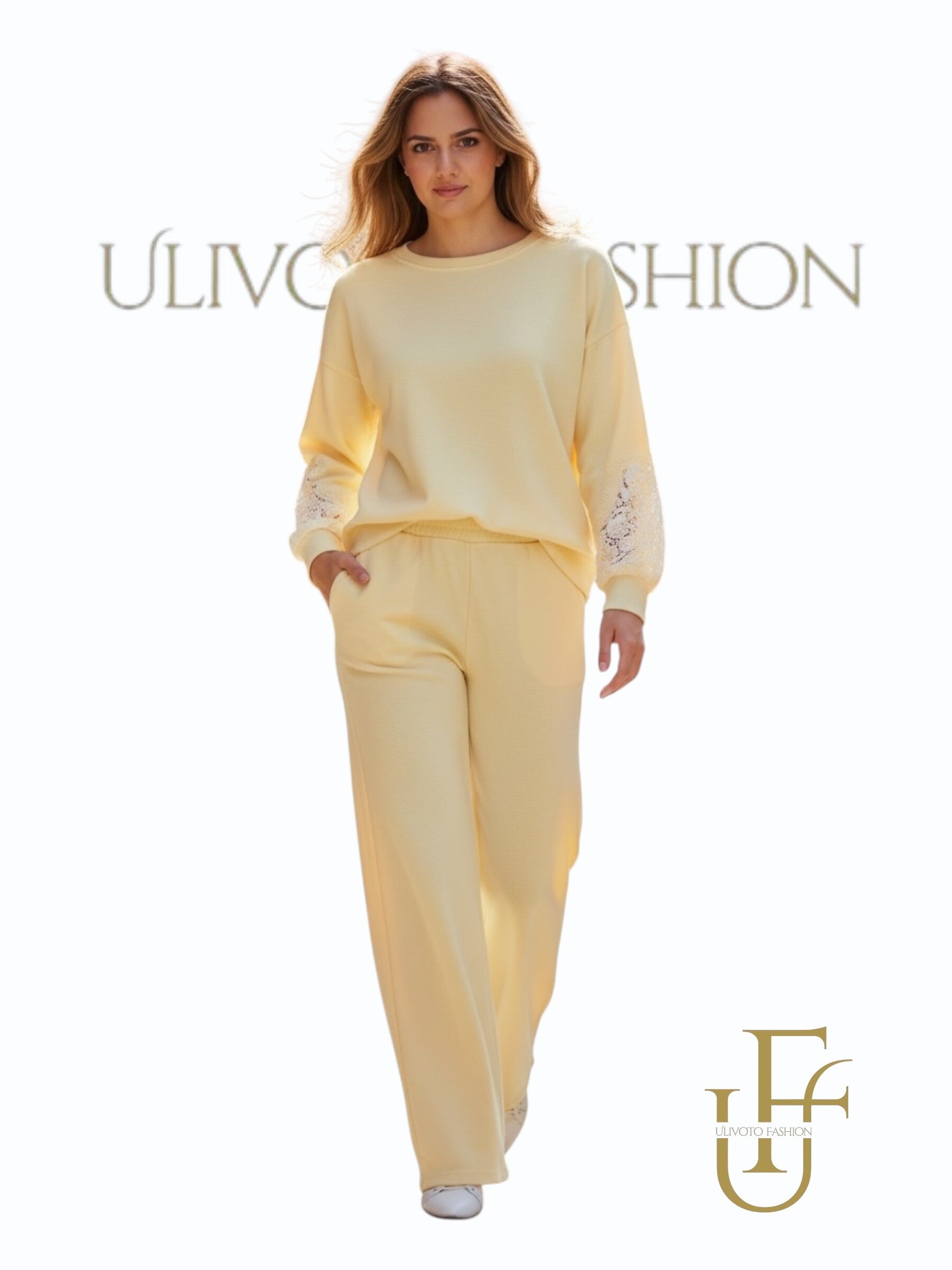 Deze stijlvolle dames set in een zachte gele kleur is de perfecte combinatie van comfort en moderne elegantie. De set bestaat uit een losvallende sweater met subtiele details op de mouwen en een bijpassende broek met een comfortabele pasvorm. Ideaal voor vrouwen die er verzorgd uit willen zien zonder in te leveren op draagcomfort.