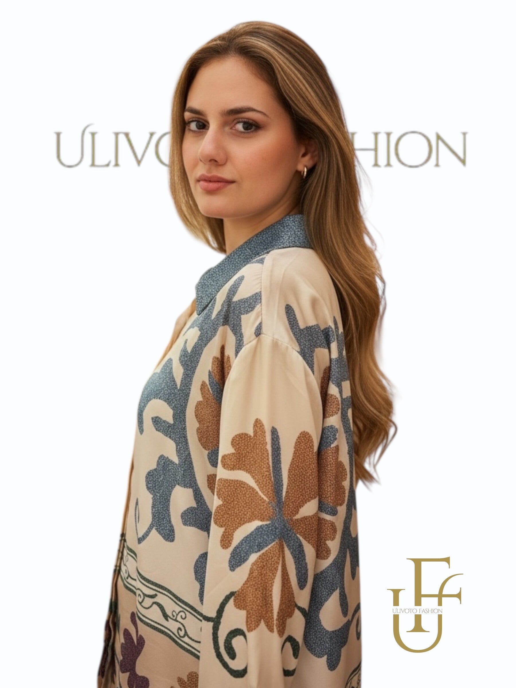 Deze elegante blouse combineert een verfijnde uitstraling met een opvallende bloemenprint. Het unieke design met contrasterende kraag en manchetten geeft de blouse een luxe en modieuze look. De soepele stof zorgt voor een comfortabel draaggevoel en een mooie pasvorm.