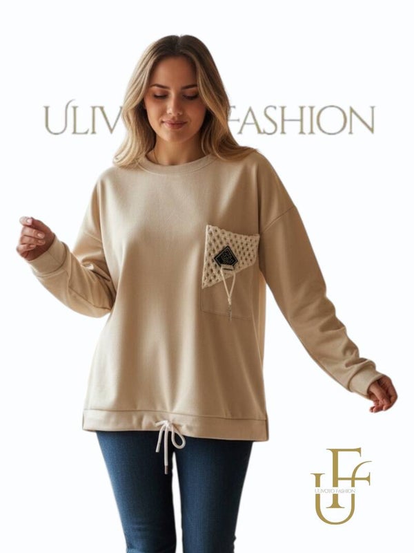 Deze stijlvolle swearter combineert comfort met een moderne, casual uitstraling. Het minimalistische design wordt verfijnd door de decoratieve borstzak met detail en het koord aan de onderzijde, waarmee je de pasvorm subtiel kunt aanpassen.De zachte stof en relaxte fit maken deze sweater ideaal voor dagelijks gebruik. Perfect te combineren met een jeans, jogpants of bijpassende broek voor een comfortabele en trendy look.