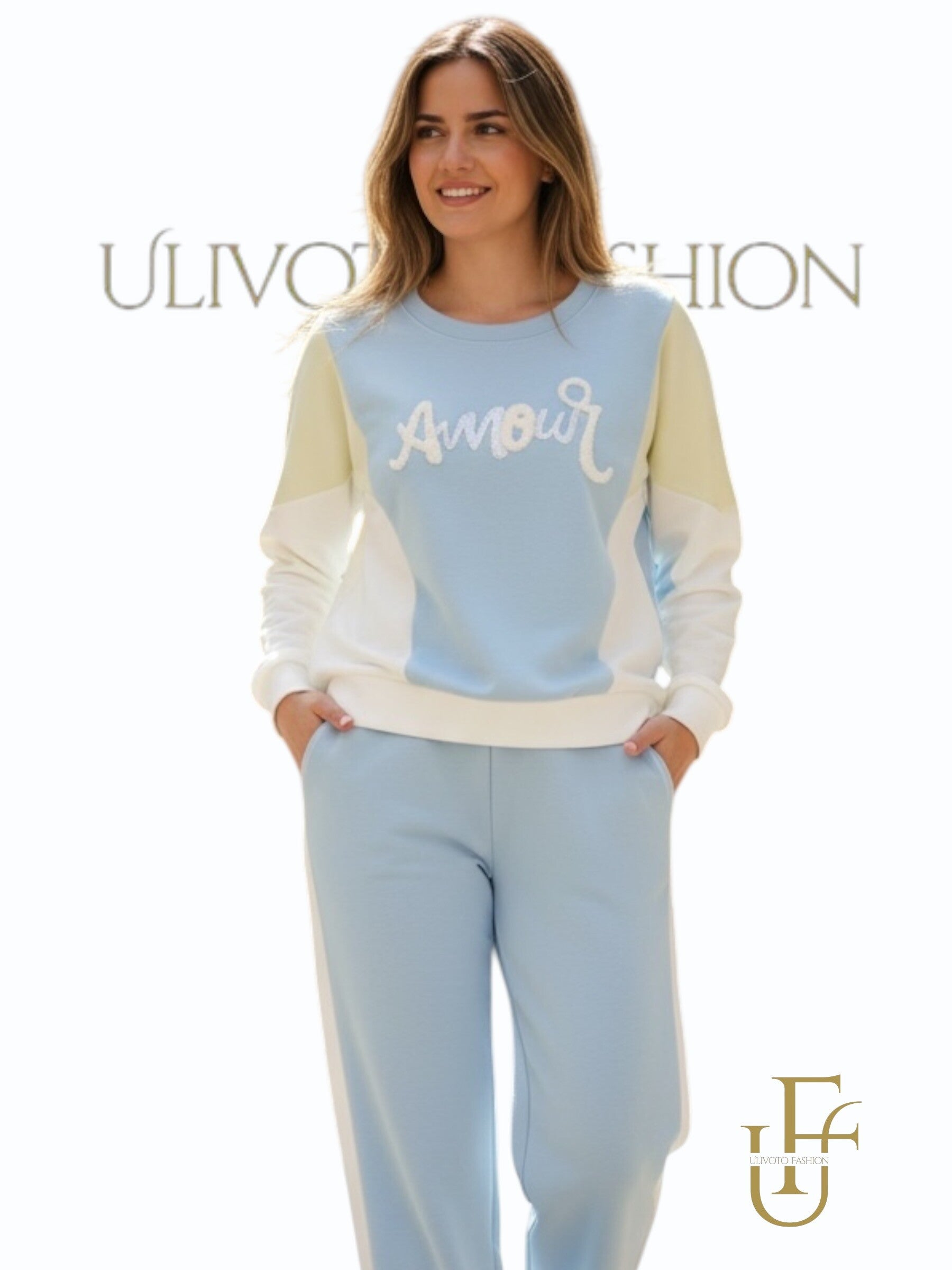 Deze stijlvolle tweedelige dames set combineert comfort met een moderne uitstraling. De top heeft een trendy colorblock design in beige en wit met een subtiele, elegante print op de borst. De bijpassende broek zorgt voor een harmonieuze en verzorgde look.
