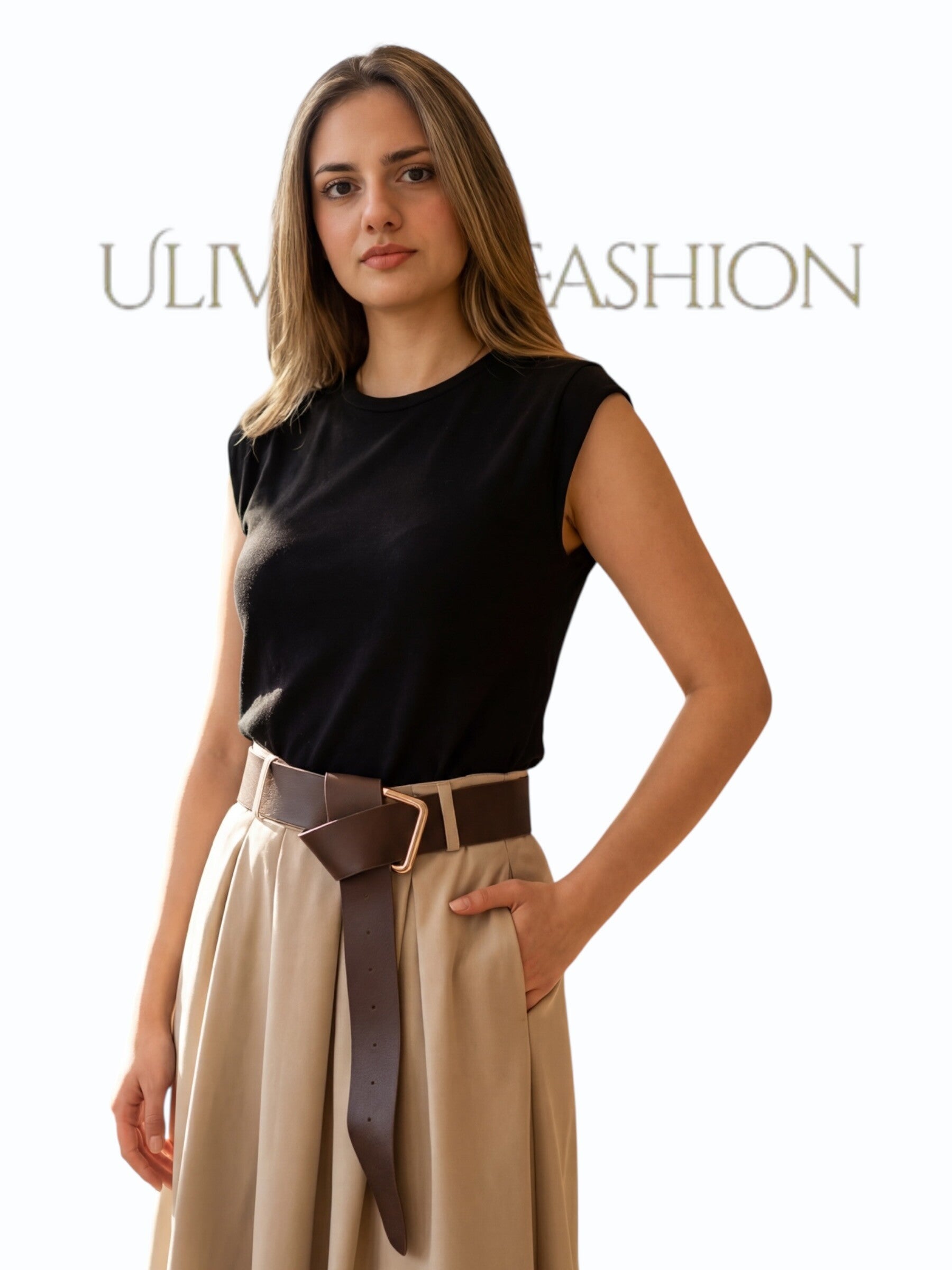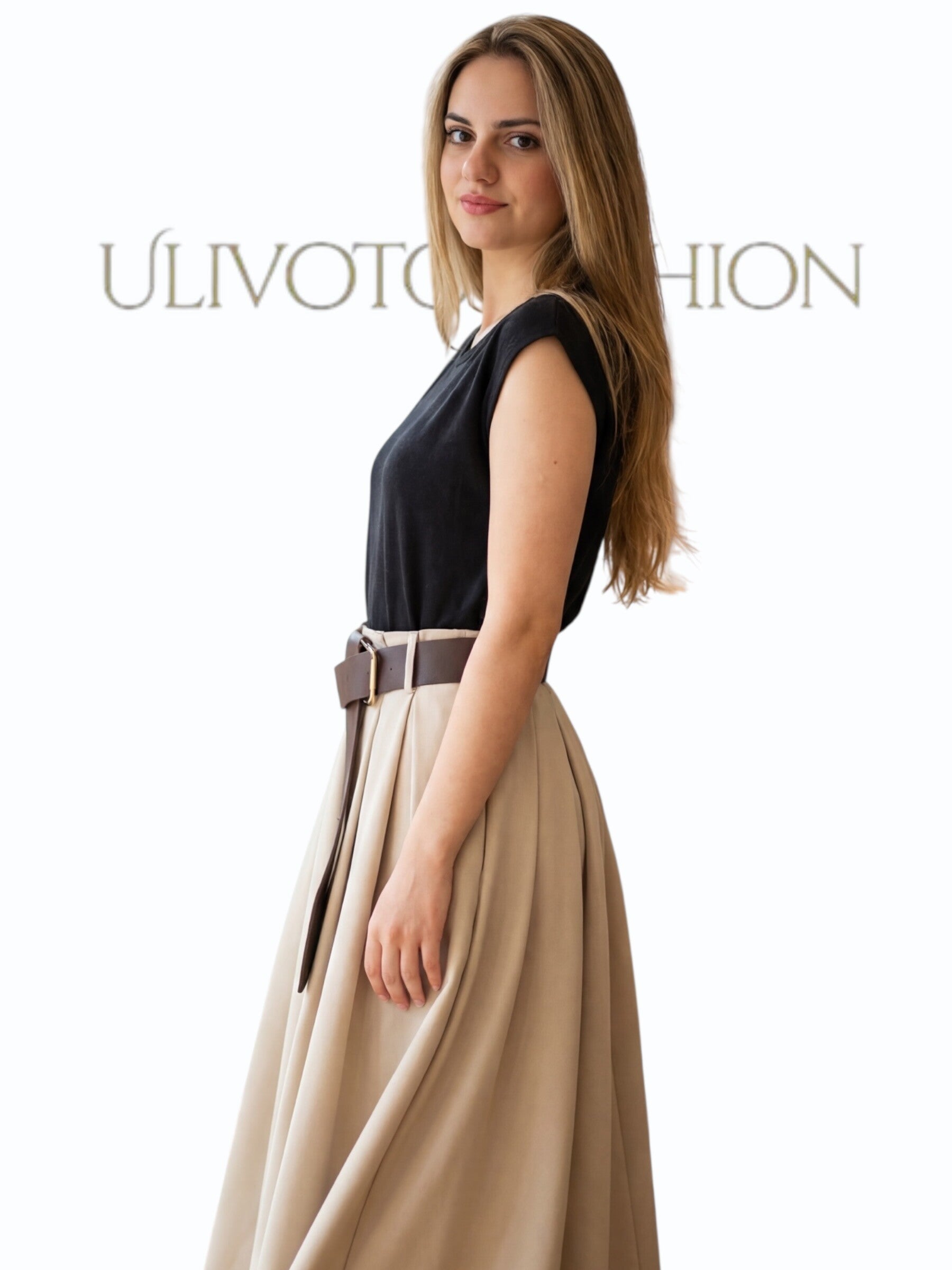 Deze stijlvolle beige damesjurk combineert minimalisme met een elegante uitstraling. Het mouwloze ontwerp en de ronde hals zorgen voor een tijdloze look, terwijl de bijpassende ceintuur het silhouet prachtig accentueert.