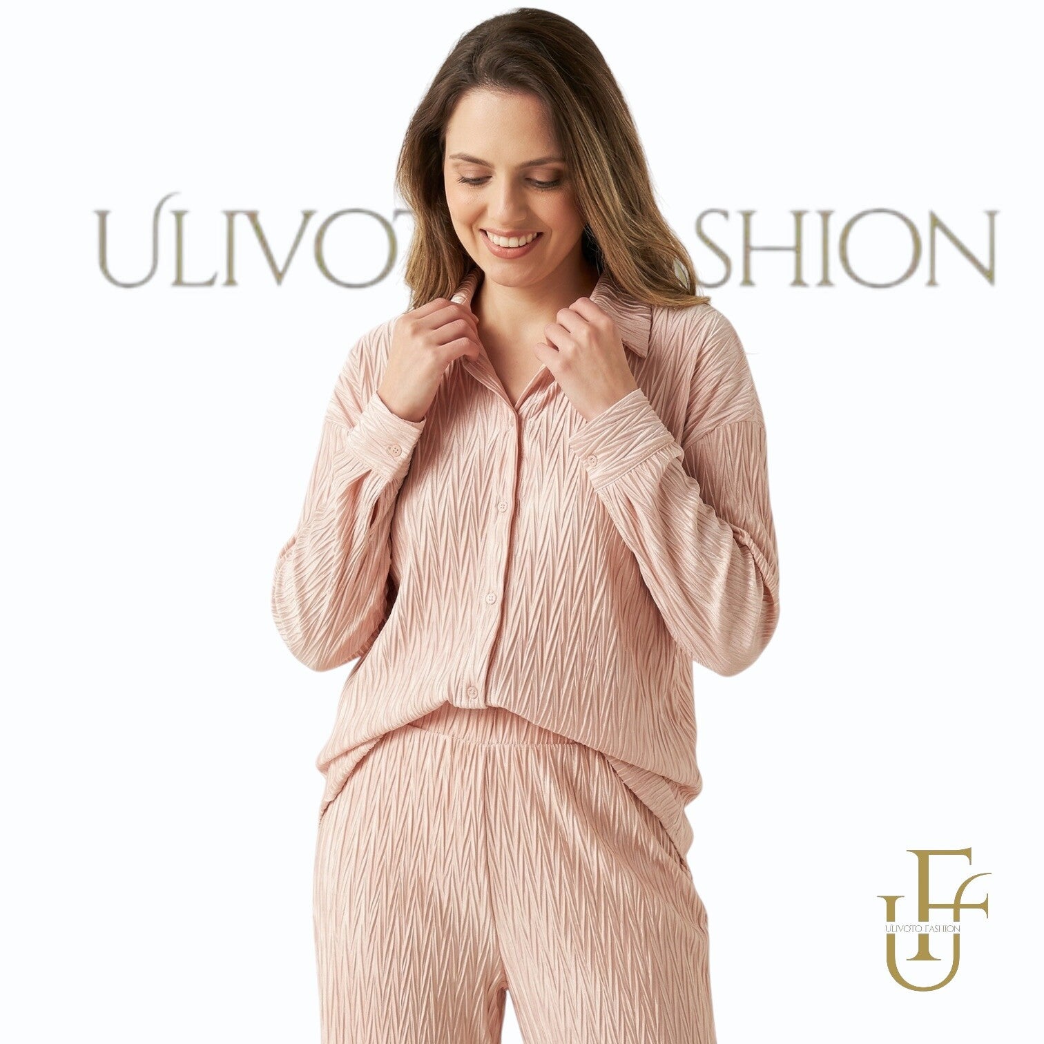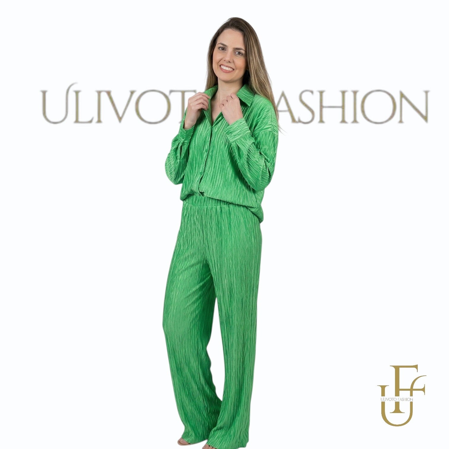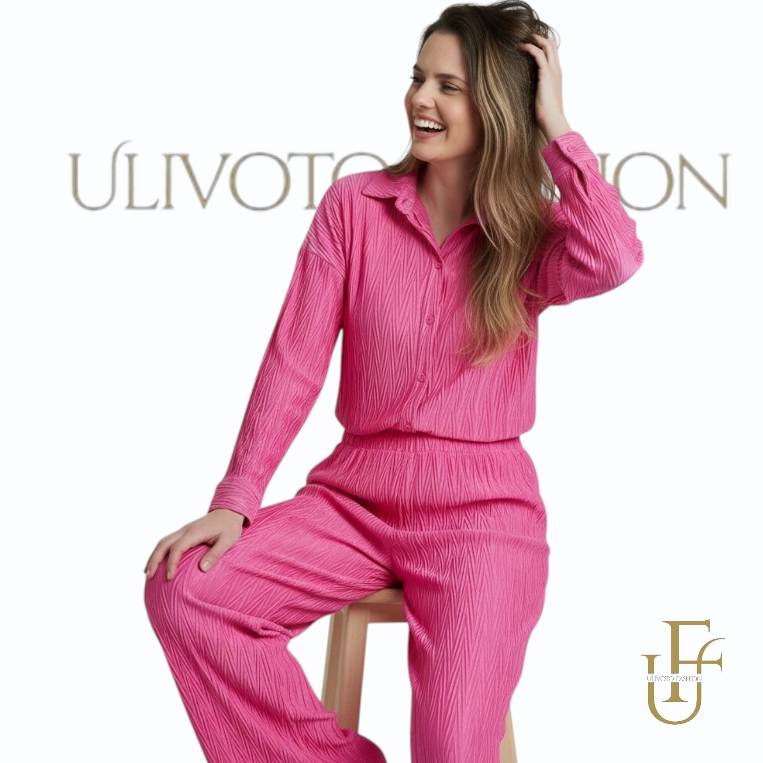 Deze stijlvolle tweedelige dames set in een prachtige fuchsia roze tint is de perfecte combinatie van elegantie en comfort. De set bestaat uit een soepelvallende blouse met lange mouwen en een bijpassende high-waist broek met elastische tailleband.